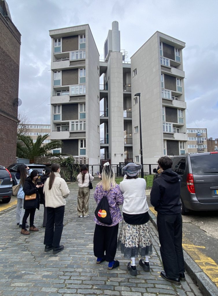 We then moved away from the Cafe to gather around and view the first stop on the tour. Peter handed out a well-designed summary of the day on an a4 page. Students were going on a 4-hour architectural sight-seeing trip around East London. He began to explain the point of the trip and why he found it interesting. The majority of the buildings on the tour could be directly or loosely categorised as ‘Brutalist’ so I was excited to see what was in store.